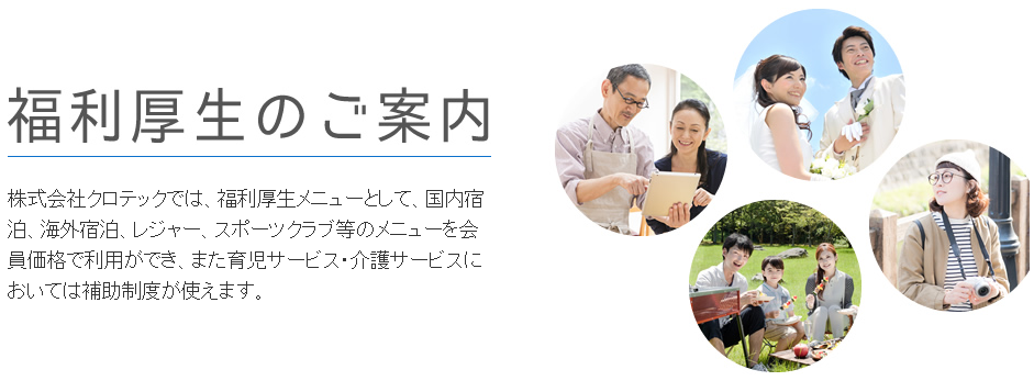 福利厚生のご案内 Human Solution Company KUROTEC クロテック福利厚生 当社は福利厚生の一環として『株式会社リロクラブ』のサービス「福利厚生倶楽部」と提携しています。「ESなくしてCSなし」とよく言われますがクロテックではCSと呼ばれる顧客満足度(customer satisfaction)を上げるには、ESと呼ばれる従業員満足度(Employee Satisfaction)を上げるべきであると考えております。「この会社に入って良かった」と思える職場環境を整えるためにも福利厚生サービスのパイオニアとして20年以上にわたり市場創造に取り組んでいる株式会社リロクラブ社のサービス「福利厚生倶楽部」を2017年8月に導入しました。社員とそのご家族は、各種(宿泊、飲食、健康、買物、娯楽)施設の優待割引きや、出産、成人、結婚、定年退職までのお祝い、その他生活相談と数多くのサービスを受けられます。 福利厚生一例 <例>※下記は一例です。・日本旅行、西鉄旅行、農協観光宿泊プランで宿泊の場合 最大おひとり様2500円補助(1万円の宿泊×4人の場合3万円で宿泊可能)・全国公共の宿、宿泊施設一泊につき大人2500円補助・映画鑑賞チケット一般1800円→1300円・ホテルオークラ東京5500円補助・カタログギフト「カタログチョイス」、カタログギフト「ザ・チョイス」、 ハーモニックのカタログギフト→本体価格から25%~40%値引き・ニッポンレンタカー、オリックスレンタカー基本料金最大55%値引き・箱根小涌園「ユネッサン」 大人4100円→2300円・としまえん 1日乗り物券大人4200円→2500円 子供3200円→1600円・サンリオピューロランド 大人3800円→2900円 子供2700円→2300円・東京ドームシティ得10チケット一冊最大6200円相当→2880円・横浜・八景島シーパラダイス アクアリゾーツパス 大人3000円→2400円 小中1700円→1250円 幼児850円→550円・鴨川シーワールド 入場券67%OFF・スパリゾートハワイアンズ 入場券大人3240円→2200円・一時保育料金 1時間300円引・介護保険支給限度額を超えた分に対して一か月最大5万円補助・糖尿病セルチェック支援制度 検査キット40%補助・入学おめでとう旅行家族旅行応援制度 国内宿泊3000円補助・卒業旅行お祝い制度 国内宿泊5000円補助・全国のリロクラブ提携ホテル(例) 素泊まり1室3名(おひとり様)1800円 朝食付き一泊1室3名(おひとり様)3300円 「福利厚生倶楽部」へのログイン 株式会社クロテックの「福利厚生倶楽部」へのログインページです。画像をクリックしますと「福利厚生倶楽部」のログインページが表示されます。 福利厚生の概要ページです。画像をクリックしますと説明ページに移動できます。