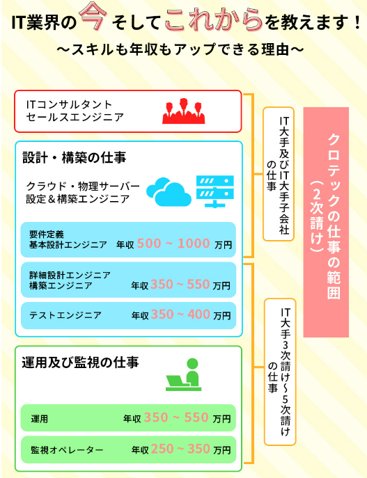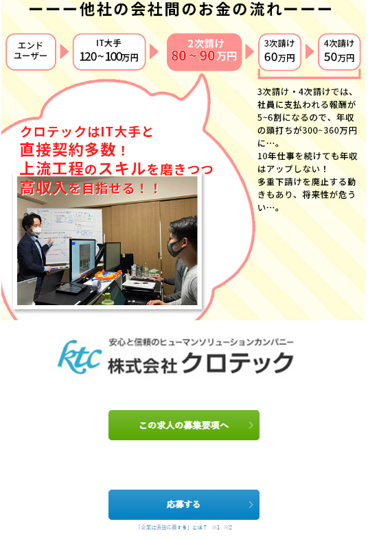 IT事業部 デューダ(doda)に求人が掲載されました / お知らせ / By 管理者権限クロテック / 2023年4月17日 富士通株式会社及びNTTデータ先端技術様など大手様と直接契約をしている株式会社クロテックのIT事業部は、デューダ様にて今回求人を掲載させて頂きました。クロテックのIT事業部は、マイクロソフト社認定のマスタートレーナーであった小林により開設された事業部です。システムの設計及び構築と言う上流工程の仕事を主に専門としている技術集団です。富士通株式会社及びNTTデータ先端技術様などは小林の人脈により、契約できており、現在、新しい技術を常に教え込むクロテックの姿勢に惚れ込んで契約をしてくださっています。なんと現在は、富士通株式会社様のクラウド部門のコアパートナーでもあります(ただのパートナーではありません)教育は、事業部長の小林自ら行います。小林はレノボ様などのイベントで登壇するなど実績のある現役のエンジニアでもあります。小林の登壇動画を観ることが出来ます。中途採用の方でも2週間の入社時研修があり、毎月新しい技術を研修するクロテックへ是非皆様も応募してください。・doda転職様での求人はこちらのリンクをクリックしてください・口コミサイト【その他】・クロテック IT事業部の活動内容はこちら・なぜクロテックのIT事業部は2週間研修を行うのか?・入社から現場配属までの流れ・株式会社クロテック IT 事業部 Instagram→皆様からの各種質問に動画で回答しています。