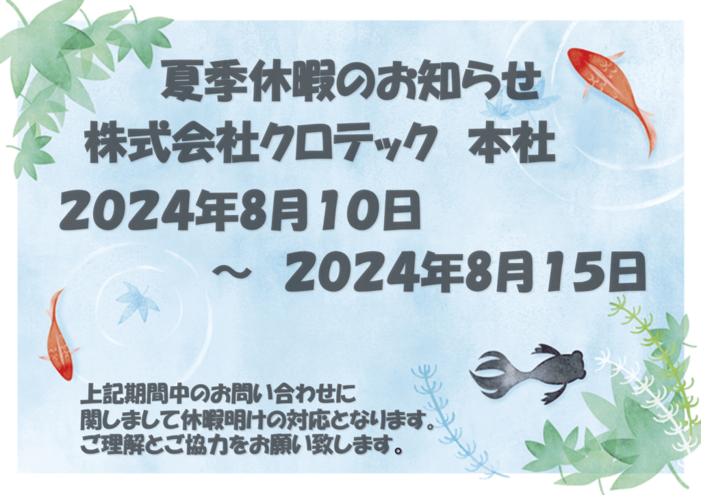 株式会社クロテック本社の夏季休暇の案内 / お知らせ / By kazu1217 / 2024年8月7日 酷暑の候、皆様におかれましてはますますご健勝の事とこころよりお慶び申し上げます。 さて、早いもので今年も夏季休暇が近づいて参りましたのでご案内申し上げます。のちほど他の事業所分もUPしますので宜しくお願い致します。休暇中の問い合わせに関しましては休暇明けの連絡になりますのでご理解とご協力をお願い致します。 まだまだ暑い日が続きますので夏バテなどなさりませんように、ご自愛専一にてお願い致します。