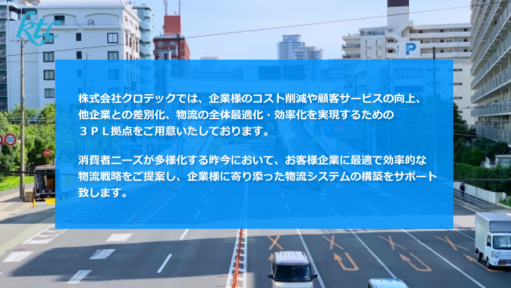 3PL拠点のご案内 Human Solution Company KUROTEC 作業効率性の高いお客様仕様での施設設計にも対応可能な物流拠点をご提案いたします。 既存物流診断 企業様の既存の物流業務の現状調査を行います。具体的な解決策を明らかにし、現状に対しての対策が行われた場合の利益を概算させて頂き、どのように実現可能かどうかを検討致します。 物流システム設計・構築・開発 入荷、入荷検品、流通加工。保護、ピッキング・仕分け、出荷検品・出荷まで一貫した物流システムを新たに構築し、企業様の業務の効率化を図ります。シミュレーターによる最適な輸送ルート、既存物流拠点の統廃合、アウトソーシングの選定など、企業様の物流コストの削減を実現いたします。 物流を知り尽くした「人の知恵」と、物流の視点から開発した「ITの支援」により、物流情報システムを開発いたします。 物流コスト削減・アウトソーシング 物流コストの分析を行い、物流コストの発生要因に対して原価把握を行います。お客様の物流コストのさらなる削減額を試算いたします。また、アウトソーシングすべき業務と企業様で行う業務を明確にして、コスト削減と効率化を図ることができるよう、弊社の物流のスペシャリストがアドバイスいたします。 3PL拠点のご案内 株式会社クロテック ロジスティクスセンター 関東地区における3PL拠点に最適!! 長期保管・短期保管に対応!! ① 総武本線 八街駅より6.5km/約13分② 東関道 佐倉ICより6.5km/約13分③ 国道51号坂戸交差点より4.4km/約7分 第一倉庫 第二倉庫 ・第一倉庫150坪・三段ラック設置中(上記緑枠部分)・現在、上記三段ラック部分の約40パレット分空きあり・倉庫内に柱がなく、自由なレイアウトが可能 ・第二倉庫150坪・ラックなどは無く、全面で使用可能・倉庫内に柱がなく、自由なレイアウトが可能・※現在全面使用中 第一倉庫内パレット一例 ・三段ラック(ラック内有効寸法:W2400×D1100×H1650) ・現在約60~80パレット分の空きあり 各種お問い合わせは下記より承っております お問い合わせはこちら